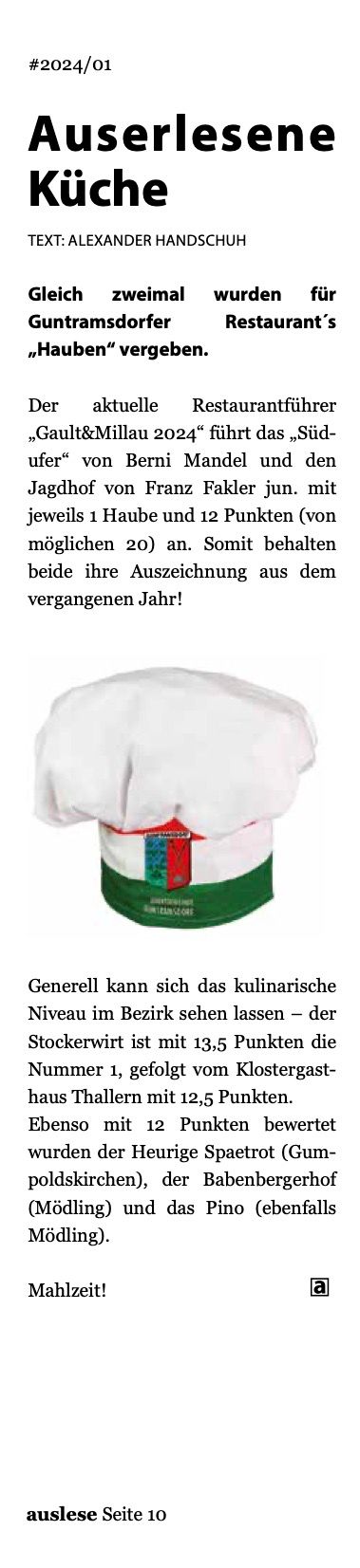 Es ist uns eine besondere Freude, auch dieses Jahr erneut mit einer Haube geehrt worden zu sein! Unser Dank gilt dem gesamten Team in Käche und Service, die diesen Erfolg ermöglicht haben und somit die Vorjahresleistung bestätigt haben.